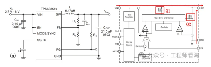 (b)是芯片內(nèi)部的功能框圖,我們可以看到有兩個MOS Q1和Q2,這種有兩個控制MOS的BUCK被稱為同步BUCK,異步BUCK中使用二極管代替Q2,把圖中的開關(guān)部分和外圍電感提取出來就構(gòu)成了圖2-2 的經(jīng)典的異步BUCK拓撲圖,圖2-2 中的S對應(yīng)圖2-1 的Q1,圖2-2 中的D對應(yīng)圖2-1 中的Q2。