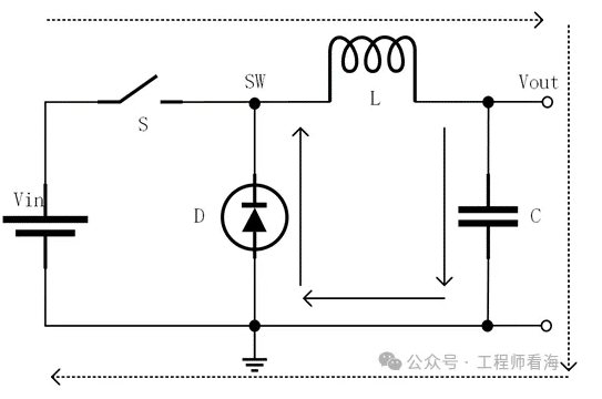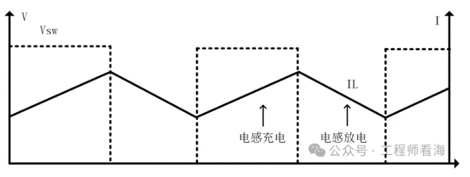 圖2-2 中,當(dāng)開關(guān)S導(dǎo)通時,SW電壓為高電壓,等于Vin,Vin給電感L充電,流過電感L的電流逐漸增加,充電電流路徑如圖中虛線箭頭所示,電感電流充電波形見圖2-3 ,SW高電平時電感處于充電狀態(tài)。