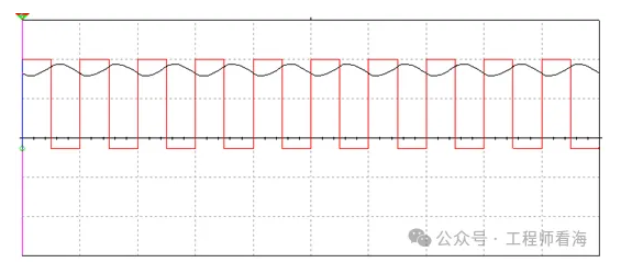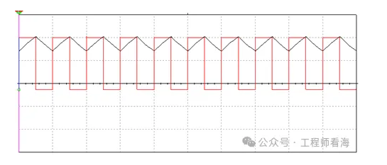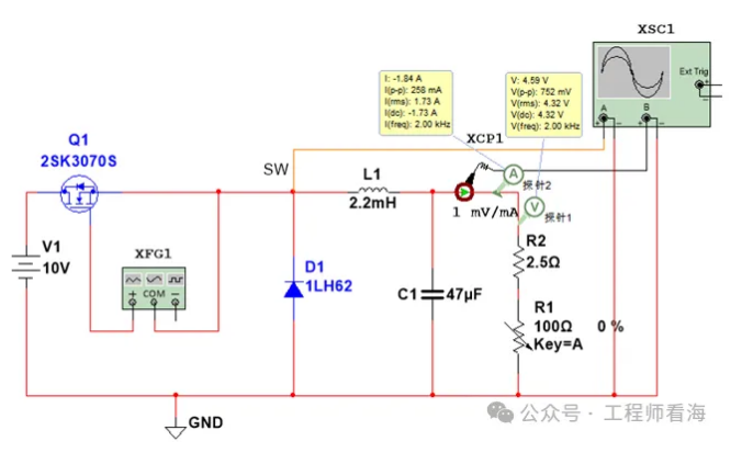 圖2-5 是在BUCK電源輸出端并聯(lián)了47uF電容后的結(jié)果,紅色方波是開關(guān)節(jié)點SW位置電壓波形(方波的-0.7V電壓在2.5.1節(jié)有詳細介紹),黑色平滑曲線是輸出的電流波形,也就是電感充放電的電流波形。通過開關(guān)管對電感充放電,可以明顯看到電流充放電時的平滑三角波形(電容有濾波效果)。輸入電壓是10V,占空比是50%,測試得到輸出電壓DC值是4.3V,接近公式2-6推導(dǎo)的10*50%=5V,思考:為什么計算和仿真相差0.7V呢?
