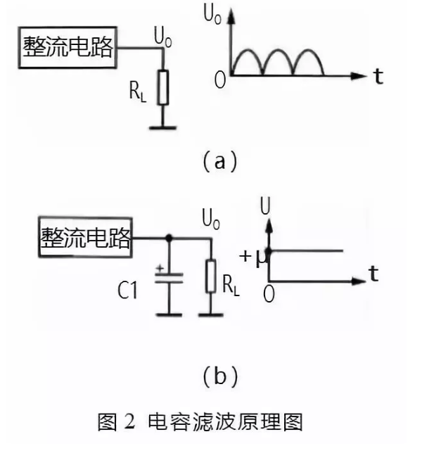 根據(jù)以上的分析,由于單向脈動性直流電壓可分解成交流和直流兩部分。在電源電路的濾波電路中,利用電容器的“隔直通交”的特性和儲能特性,或者利用電感“隔交通直”的特性可以濾除電壓中的交流成分。圖 2 所示是電容濾波原理圖。