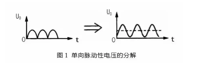 但根據(jù)波形分解原理可知,這一電壓可以分解一個直流電壓和一組頻率不同的交流電壓,如圖 1(b)所示。在圖 1(b)中,虛線部分是單向脈動性直流電壓 U。中的直流成分,實線部分是 UO 中的交流成分。