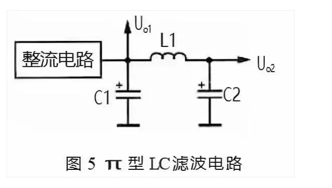 圖 5 所示是 π 型 LC 濾波電路。π 型 LC 濾波電路與 π 型 RC 濾波電路基本相同。這一電路只是將濾波電阻換成濾波電感,因為濾波電阻對直流電和交流電存在相同的電阻,而濾波電感對交流電感抗大,對直流電的電阻小,這樣既能提高濾波效果,又不會降低直流輸出電壓。