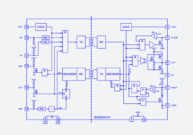 同時,芯片具有過電流和短路保護的DESAT檢測功能、有源米勒箝位功能以及兩級關(guān)斷(TLTO)功能,常被用于逆變器和DC/DC轉(zhuǎn)換器等場合。