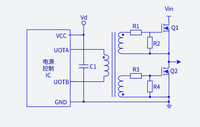 雙端變壓器耦合柵極驅(qū)動電路可同時驅(qū)動兩個MOS管,多用于高功率半橋和全橋轉(zhuǎn)換器中,其電路結(jié)構(gòu)如圖。