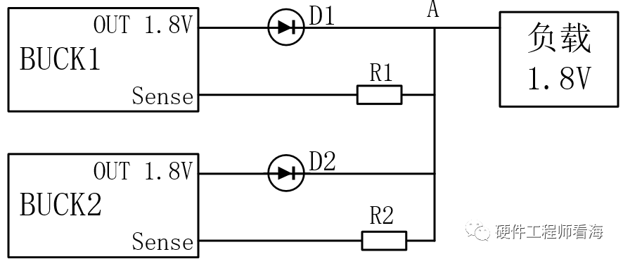 再下圖中,R1=R2=0Ω,為了防止反灌,兩個buck輸入均接入了二極管,并且sense在二極管后面,來抵消二極管導(dǎo)通電壓的影響,保證A點(diǎn)的電壓為1.8V,而實(shí)際上BUCK輸出端是高于1.8V的。