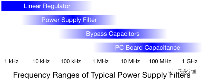 高頻紋波會直接穿過線性穩(wěn)壓器。紋波來自開關(guān)電源、數(shù)字電路和無線電干擾。在頻率高于 10 kHz 時,大多數(shù)線性穩(wěn)壓器開始失效。分布在芯片之間的小旁路電容在約1MHz時開始有效。由電感和電容組成的低通濾波電路,可以去除10kHz到1MHz之間的紋波。