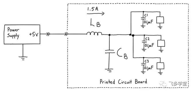 在上圖的簡單設(shè)計中,假設(shè)電源穩(wěn)壓器是在板外,通過連接器輸入一個穩(wěn)定的電壓。當有一個本地穩(wěn)壓器時,設(shè)計更簡單,有時可以減少電源濾波器。