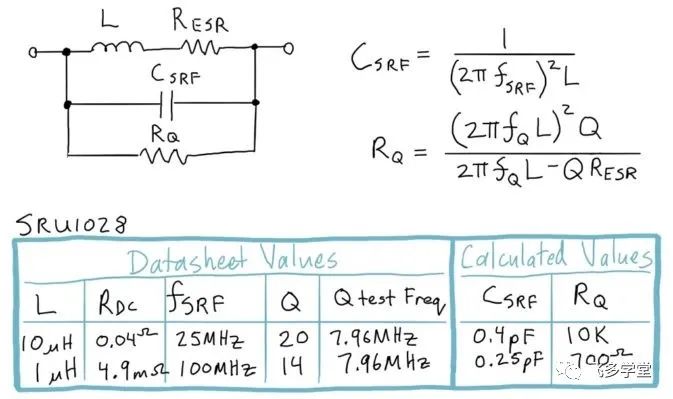 上圖的電感模型使用了四個元件。電感L和數(shù)據(jù)表上的L相同。串聯(lián)電阻RESR和數(shù)據(jù)表上的RDC相同。RQ和CSRF的值是根據(jù)數(shù)據(jù)表上的fSRF,Q和Q測試頻率計算出來的。