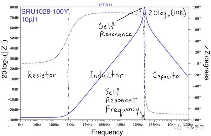 這些額外的元件使得電感具有上圖所示的阻抗特性。實線曲線是阻抗的分貝幅值,虛線曲線是阻抗的相位角(phase angle)。在1kHz以下,電感表現(xiàn)為一個小電阻RDC。在1kHz以上,它表現(xiàn)為一個電感,直到接近自諧振頻率(SRF)。在SRF附近的一小段頻率范圍內(nèi),電感表現(xiàn)為一個大阻值電阻,其值為RQ。在SRF以上,電感表現(xiàn)為一個電容CSRF。
