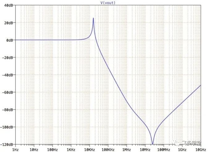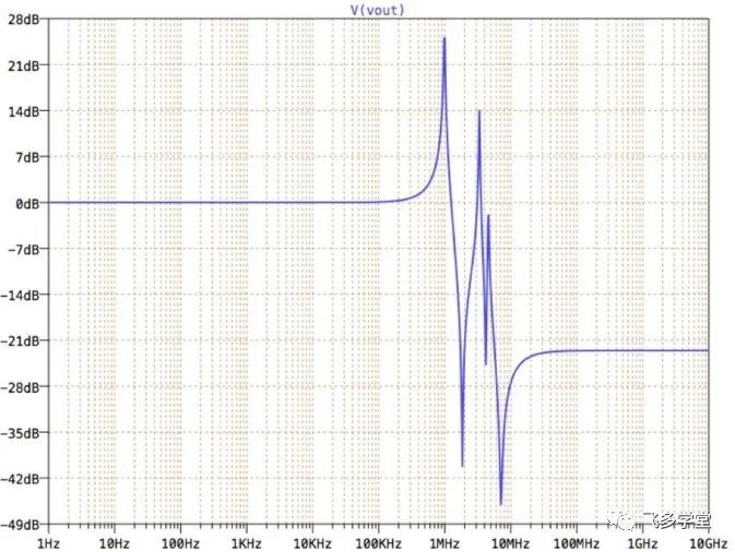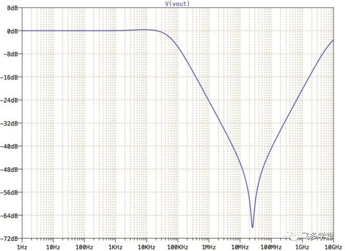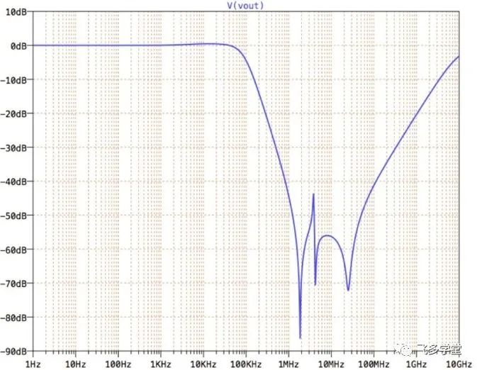 這個濾波器的頻率響應是V(VOUT)/V(VIN),但由于在仿真中V(VIN) = 1,所以我們直接看V(VOUT)的輸出曲線是一樣的。
