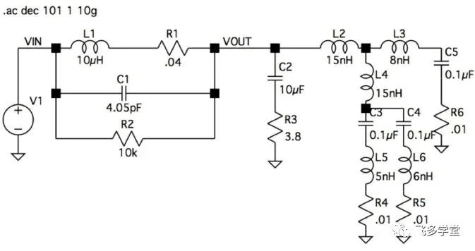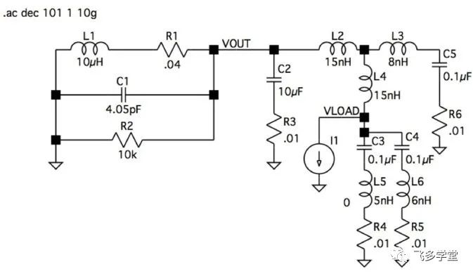 旁路電容還可以與電源分配網(wǎng)絡中的電感共振。在電源輸入濾波器處阻尼共振并不能保證所有由負載電流引起的共振也會被阻尼,但通常會有所幫助。為了演示潛在問題,這里是未阻尼(R3 = 0.01歐姆)版本的濾波器,其中一個負載點有一個交流電流源。