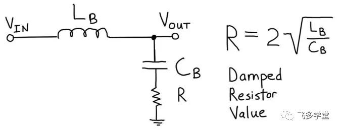 這個頻率下的電源紋波會增加而不是減少。由于這種共振的頻率范圍很窄,所以在測試中很容易忽略這種共振的影響。LB和CB的值有較大的公差,而且隨著時間和溫度的變化而漂移。為了解決這個共振問題,可以增加一個串聯(lián)電阻。一個好的阻尼電阻值的初步估計是: