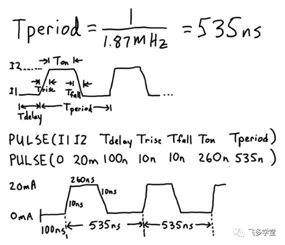 我用上面示意圖中顯示的脈沖電流源模擬了脈沖負載。這個例子顯示了幅值為20mA、周期為535ns的脈沖。當脈沖電流源的周期與共振頻率的倒數(shù)相等時,電壓擺動最大。
