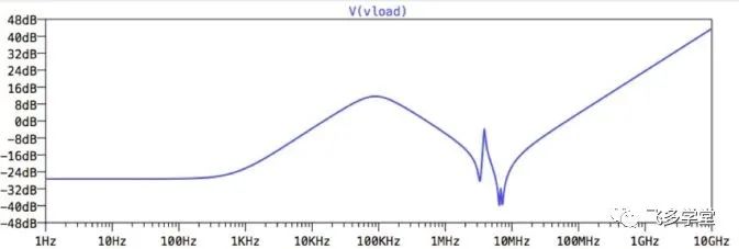 VLOAD處的阻抗為v(VLOAD)/i(I1)。由于I1中的交流電流設(shè)定為1,所以阻抗就是v(VLOAD):