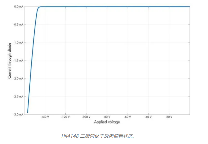 到目前為止,我們討論了稱為正向偏置的情況。如果二極管被反向偏置,即 p 側的電壓低于 n 側,該元件理論上保持不導電。嗯……在一定程度上是這樣。