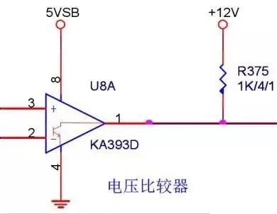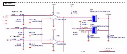 分析一下該電路,上面的比較器U8A當(dāng)有VCC輸出時經(jīng)過分壓電阻分壓后,輸入到同相端(V+),其電壓大于5VSB經(jīng)分壓后輸入到反相端(V-)的電壓,內(nèi)部晶體管截止,輸出經(jīng)上拉電阻的電源12v(同時下面的比較器U8B同相端電壓也大于反相端,內(nèi)部晶體管也是截止),N溝道場管Q37導(dǎo)通,輸出VCC5V。同時P溝道場管Q293截止。反之,當(dāng)反相端電壓大于同相端電壓時,內(nèi)部晶體管導(dǎo)通,上拉電源12V被拉低為低電平,N溝道場管Q37截止,同時P溝道場管Q293導(dǎo)通,輸出5VSB。這個就是5VDUAL產(chǎn)生電路。