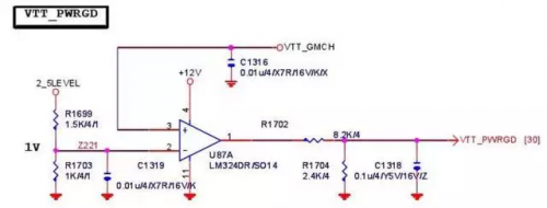 分析一下電路,2.5v經(jīng)電阻分壓得到1V輸入到V-端,當(dāng)總線電壓正常產(chǎn)生1.2v時,輸入到V+,此時V+電壓比V-電壓高,輸出一個高電平到CPU電源管理芯片的EN開啟腳。如果總線電壓沒輸出或不正常少于1v,此時V+電壓比V-電壓低,輸出低電平。