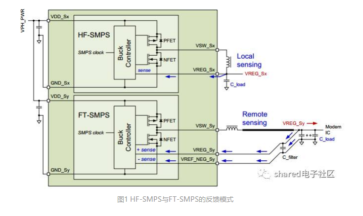 FT-SMPS是一種高精度的、支持快速瞬態(tài)響應(yīng)的電源模式,主要為應(yīng)用處理器、GPU、CORE、調(diào)制解調(diào)器等供電。FT-SMPS支持多相開關(guān)電源,支持遠端差分反饋來檢測動態(tài)負載終端,因此其輸出電容靠近負載端放置。HF-SMPS與FT-SMPS的反饋模式如圖1所示。