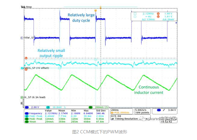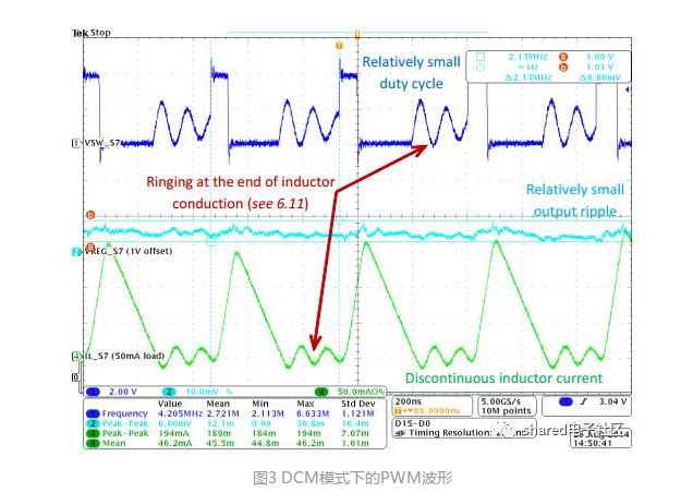 當電路工作在中等負載或重負載的情況下,電源會處于PWM模式,此時電感電流連續(xù)。針對瞬態(tài)響應(yīng)、紋波、效率、外部器件等因素,開關(guān)頻率以此優(yōu)化,用來獲得最佳的電源性能。根據(jù)電感電流是否連續(xù),PWM模式又可以分為連續(xù)傳導(dǎo)模式(CCM)和非連續(xù)傳導(dǎo)模式(DCM),其電壓電流波形如圖2、圖3所示。DCM模式下的振蕩小編在之前的《BUCK電源振蕩原理》一文中已做詳細解釋,這里就不再介紹了。