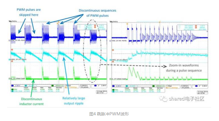 當電路工作在輕負載的情況下,PWM模式下效率非常低(MOS導(dǎo)通時,開關(guān)損耗占主導(dǎo)地位),因此,通過跳過一些不必要的脈沖(減少開關(guān)次數(shù))來提高效率。因為跳脈沖仍屬于PWM模式,所以仍能保持很低輸出電壓紋波。跳脈沖PWM模式波形如圖4所示,各脈沖的頻率恒定,但占空比逐漸減小。