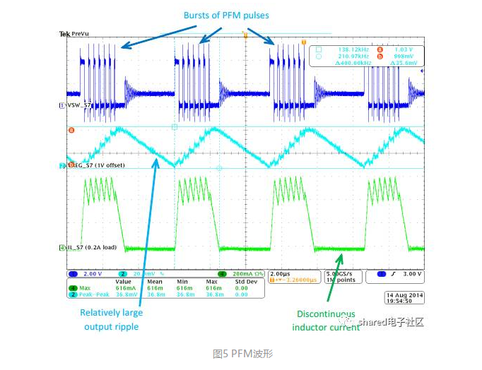 PWM模式是一種恒定頻率脈沖的模式,HF-SMPS和FT-SMPS同時也支持PFM模式,PFM是脈沖頻率可變的。因為能夠同時減少開關(guān)損耗和地上的電流損耗,因此在輕負載的情況下,PFM模式的效率更高。如圖5所示,我們觀察到PFM模式類似于上述的跳脈沖PWM模式,只是PFM模式下脈沖頻率是變化的。與上述模式對比發(fā)現(xiàn)。PFM的輸出電壓紋波是最大的。