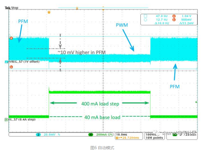自動模式其實就是一種不需要軟件參與的,能夠根據(jù)負載的變化的情況,自動將電路工作模式在PWM和PFM之間切換的一種機制。當今智能手機使用的PMIC一般都具備這個功能。如圖6,當輸出電流在40mA和400mA變化時,PFM和PWM也隨之改變。另外為了防止PFM模式下輸出電壓跌落,因此控制器會自動地抬高PFM的輸出電壓,這種平衡只在HF-SMPS電源中才有。