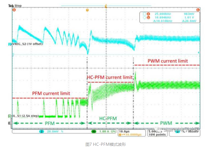 HC-PFM模式是在PFM到PWM轉(zhuǎn)換過程中出現(xiàn)的短暫的PFM模式。當電路工作在PFM模式時,負載突然加重導(dǎo)致輸出電壓跌落,因為無法快速的切換到PWM模式,所以需要一些時間來預(yù)熱PWM電路。為了防止這個預(yù)熱過程輸出電壓將的太低,PFM的電流可以被控制在正常的PFM和PWM之間,這個幾us的過程被稱為HC-PFM,如圖7所示。