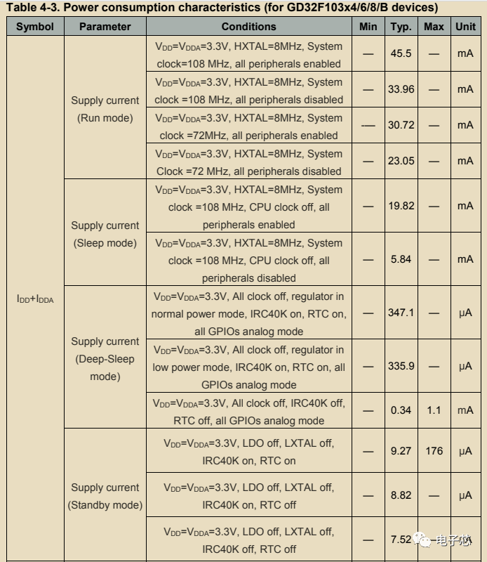 對(duì)于所用方案或者說(shuō)是芯片的功耗到底,同樣還是來(lái)到官方手冊(cè)中查看相關(guān)數(shù)據(jù)。關(guān)于如何查找數(shù)據(jù)手冊(cè),大家可以看下我之前的文章《大家是如何查找芯片數(shù)據(jù)手冊(cè)的?非官網(wǎng)下的手冊(cè)是否準(zhǔn)確呢?》。那么跟著芯哥來(lái)看下GD32某款芯片功耗如何。在數(shù)據(jù)手冊(cè)中看到,GD32F103一共有四種模式,分別是運(yùn)行模式、休眠模式、深度休眠模式、備用模式。那么每個(gè)模式的消耗電流以及測(cè)試條件都寫(xiě)的清清楚楚。但是要注意這也是官方自行測(cè)試的結(jié)果,不代表你使用之后就完全是一模一樣的功耗,作為參考可以,自己在項(xiàng)目中還需要實(shí)際測(cè)試。