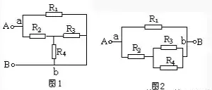 解:設(shè)電流由A端流入,在a點(diǎn)分叉,b點(diǎn)匯合,由B端流出。支路a—R1—b和a—R2—R3(R4)—b各點(diǎn)電勢逐次降低,兩條支路的a、b兩點(diǎn)之間電壓相等,故知R3和R4并聯(lián)后與R2串聯(lián),再與R1并聯(lián),等效電路如圖2所示。