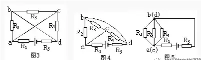 再把連接a、C節(jié)點(diǎn)的導(dǎo)線縮成一點(diǎn),把連接b、d節(jié)點(diǎn)的導(dǎo)線也縮成一點(diǎn),并把R5連到節(jié)點(diǎn)d的導(dǎo)線伸長線上(圖5)。由此可看出R2、R3與R4并聯(lián),再與R1和R5串聯(lián),接到電源上。