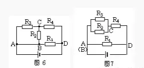 解:電流從電源正極流出過A點(diǎn)分為三路(AB導(dǎo)線可縮為一點(diǎn)),經(jīng)外電路巡行一周,由D點(diǎn)流入電源負(fù)極。第一路經(jīng)R1直達(dá)D點(diǎn),第二路經(jīng)R2到達(dá)C點(diǎn),第三路經(jīng)R3也到達(dá)C點(diǎn),顯然R2和R3接聯(lián)在AC兩點(diǎn)之間為并聯(lián)。二、三絡(luò)電流同匯于c點(diǎn)經(jīng)R4到達(dá)D點(diǎn),可知R2、R3并聯(lián)后與R4串聯(lián),再與R1并聯(lián),如圖7所示。