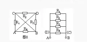 例4.如圖8所示,已知R1=R2=R3=R4=2Ω,求A、B兩點(diǎn)間的總電阻。