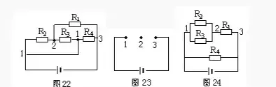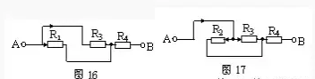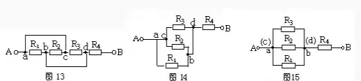 仍以圖13為例,設(shè)電流由A端流入,B端流出,先撤去R2,由圖16可知R1、R3有電流通過。再撤去電阻R1,由圖17可知R2、R3仍有電流通過。同理撤去電阻R3時(shí),R1、R2也有電流通過由并聯(lián)電路的特點(diǎn)可知,R1、R2和R3并聯(lián),再與R4串聯(lián)。