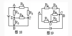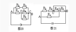 方案二:選取A—R1—D—R4—C—B為一條獨(dú)立支路,再分別安排R2、R3和R5,的位置,構(gòu)成等效電路圖20。