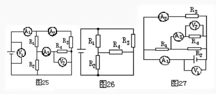解:先將電流表去,用一根導(dǎo)線代摘替,再摘去電壓表視為開路,得圖26。然后根據(jù)圖25把電流表和電壓表補(bǔ)接到電路中的對應(yīng)位置上,如圖27所示。