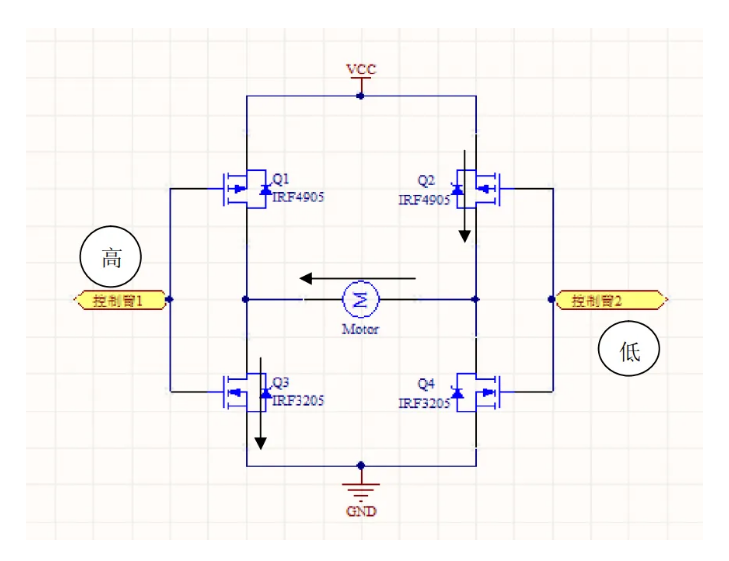 控制臂1置低電平、控制臂2置高電平時(shí),Q2、Q3關(guān)閉,Q1、Q4導(dǎo)通,電機(jī)左端高電平,右端低電平,所以電流沿箭頭方向流動(設(shè)為電機(jī)反轉(zhuǎn))。