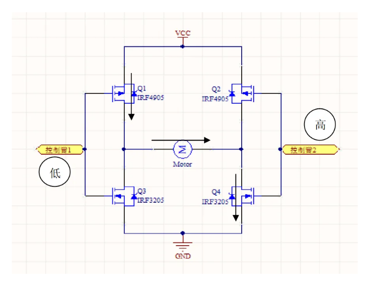 正因?yàn)檫@個特點(diǎn),在連接好下圖電路后,控制臂1置高電平(U=VCC)、控制臂2置低電平(U=0)時(shí),Q1、Q4關(guān)閉,Q2、Q3導(dǎo)通,電機(jī)左端低電平,右端高電平,所以電流沿箭頭方向流動(設(shè)為電機(jī)正轉(zhuǎn))。