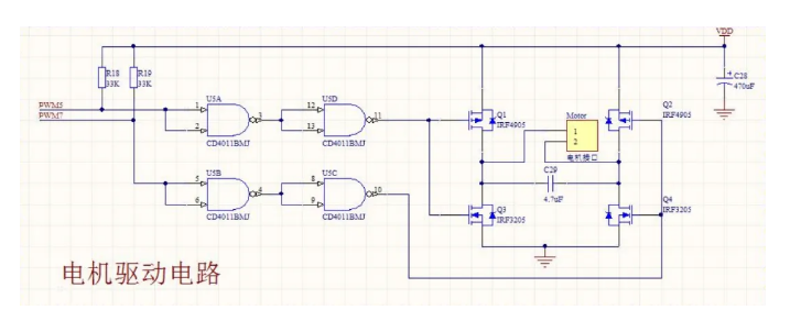 兩者結(jié)合就是下面的電路:調(diào)試時(shí)兩個PWM輸入端其中一個接地,另一個懸空(上拉置1),電機(jī)轉(zhuǎn)為正常。監(jiān)視MOS管溫度,如發(fā)熱立即切斷電源檢查電路。CD4011的14引腳接7.2V,7引腳接地。
