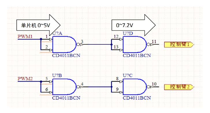 下圖是由與非門CD4011組成的柵極驅(qū)動電路,因?yàn)閱纹瑱C(jī)輸出電壓為0~5V,而我們小車使用的H橋的控制臂需要0V或7.2V電壓,才能使場效應(yīng)管完全導(dǎo)通,PWM輸入0V或5V時(shí),柵極驅(qū)動電路輸出電壓為0V或7.2V,但前提是CD4011電源電壓為7.2V,故CD4011僅做“電壓放大”之用。