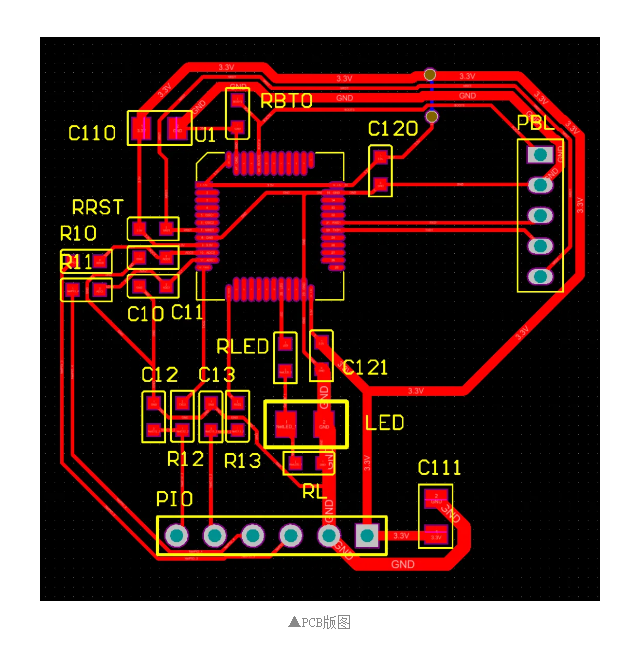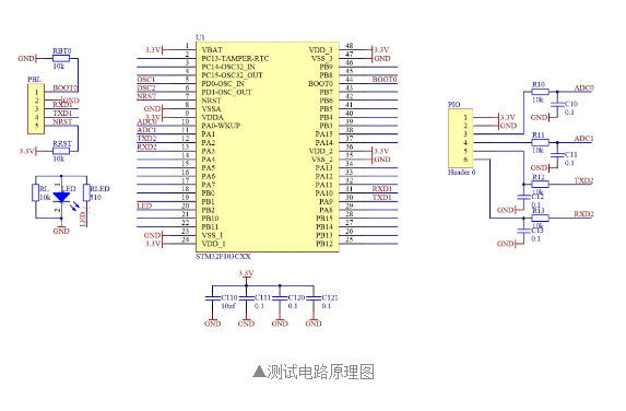 設計基于STM32F103的測試電路板。這顆芯片我手邊有很多,所以選擇它進行實驗。利用它的 串口2 進行測試。串口1用于程序的下載。使用RC低通濾波器對 TXD2信號進行濾波。實際上 RXD2 是沒有使用的。另外,還將兩路ADC引導端口。這樣,可以利用ADC對外邊送入的信號進行采集之后,再從 TXD2 送出,驗證一下對音頻信號的采集與合成的功能。布置單面測試電路板。其中包括一個飛線,使用 0 歐姆電阻進行跳線。