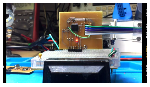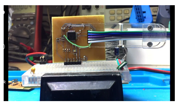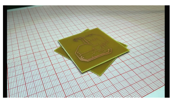 一分鐘之后獲得了兩塊測試PCB電路板,其中有一塊有點過腐蝕。使用另外一塊比較正常的進行測試。