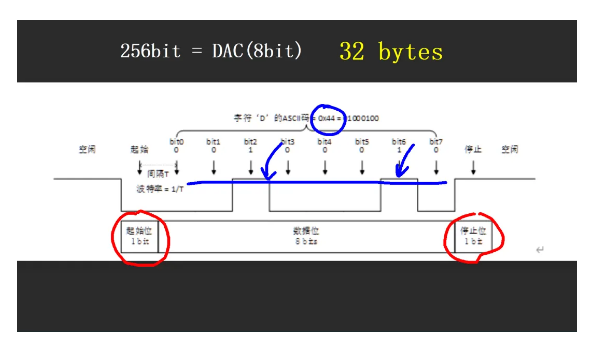 單片機的串口發(fā)送一個字節(jié)的信號波形中,包括一個bit 的起始位,一個bit 的停止位。它們分別是0 和 1,這是無法改變的。中間八個bit的數(shù)據(jù)位是可以改變的。比如發(fā)送0x44,其中就會包含有兩位高電平。這樣就有了8個可以被控制的高低電平的數(shù)據(jù)位。那么這就可以實現(xiàn) 3bit 位的 DAC輸出了。如果想實現(xiàn) 8bit 的 DAC輸出。則需要 256個可以被控制的數(shù)據(jù)位。這樣只要將連續(xù)32個發(fā)送字節(jié)合在一起,變可以形成256位可以控制高低電平的信號波形。從而實現(xiàn) 8bit 的 DAC 輸出了。下面通過單片機測試一下這種串口輸出模擬量的性能。