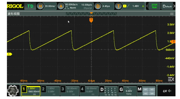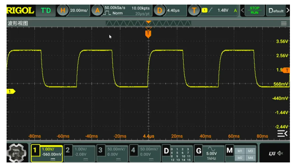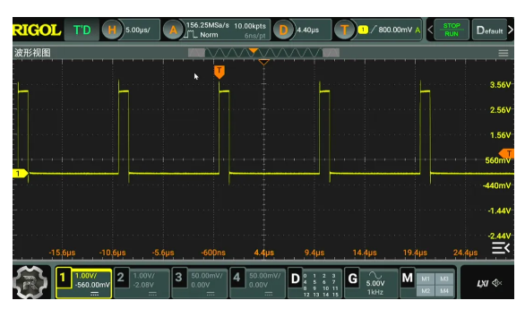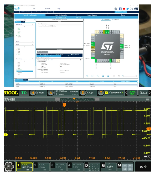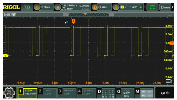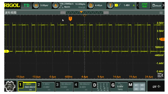 設置單片機的 UART2 的基本參數(shù)。輸出波特率為 1MHz。這樣可以提高輸出信號的更新率。通過示波器可以測量到輸出信號 每一位的時間 為1微秒,對應 1MHz的波特率。啟動DMA輸出模式,UART2 便可以通過DMA持續(xù)發(fā)送內(nèi)存中 32 個字節(jié)內(nèi)容。