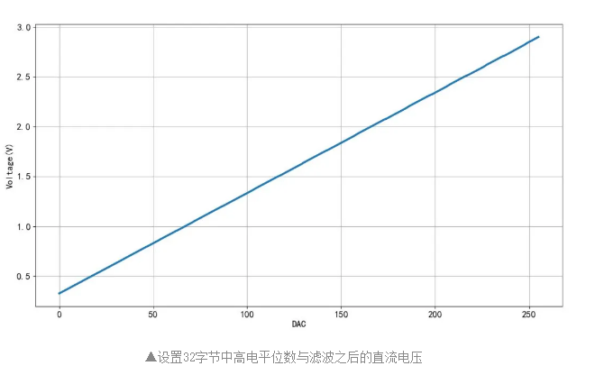 下面分別設置32個字節(jié)中,高電平位數(shù)從0變化到255,測量濾波之后的輸出直流電壓??梢钥吹诫S著位數(shù)的增加,輸出直流電壓線性上升。由于串口發(fā)送字節(jié)存在著起始位和停止位,所以對應的直流信號不是從零開始,最高電平也不是輸出信號的最高值。