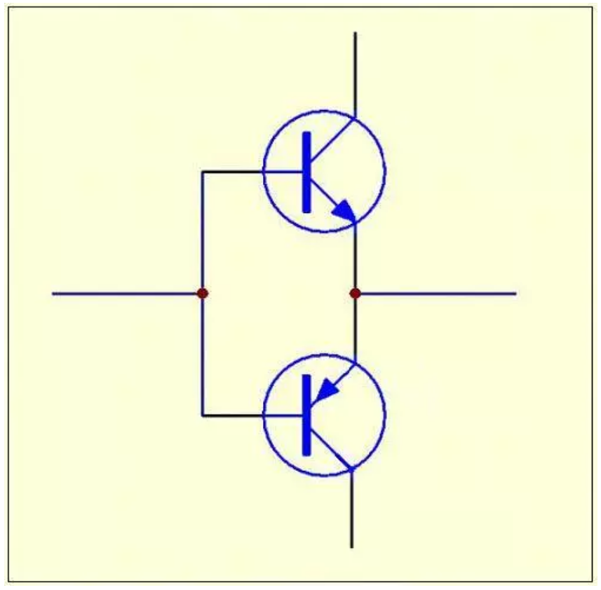 由于此結(jié)構(gòu)畫出的電路圖有點兒像印第安人的圖騰柱,所以叫圖騰柱式輸出(也叫圖騰式輸出)。輸出極采用一個上電阻接一個NPN型晶體管的集電極,這個管子的發(fā)射極接下面管子的集電極同時輸出;下管的發(fā)射極接地。兩管的基極分別接前級的控制。就是上下兩個輸出管,從直流角度看是串聯(lián),兩管聯(lián)接處為輸出端。上管導通下管截止輸出高電平,下管導通上管截止輸出低電平,如果電路邏輯可以上下兩管均截止則輸出為高阻態(tài)。在開關(guān)電源中,類似的電路常稱為“半橋”。