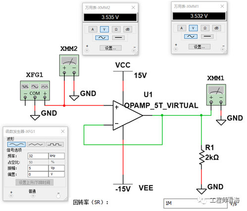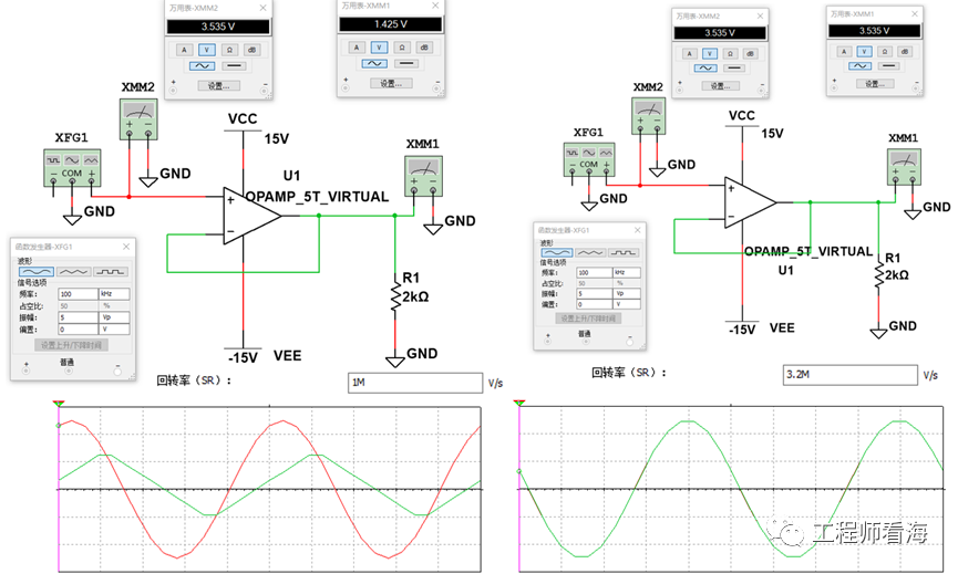 如果我們想處理這個(gè)100khz&5v的信號(hào),壓擺率應(yīng)該是多少呢?根據(jù)前文介紹,壓擺率SR要大于2πAf,即SR要大于2*3.14*5*100000=3.14M V/s,我們把標(biāo)準(zhǔn)運(yùn)放模型的壓擺率改為3.2M V/s再試下。