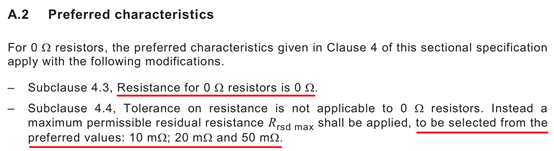 針對這兩個問題,我專門查了一下電阻的標(biāo)準(zhǔn)。根據(jù)EN60115-2電阻標(biāo)準(zhǔn)文件記載,0Ω電阻的阻值是0Ω,但也會有偏差。0Ω最大電阻偏差有三種可以選擇,分別為10mΩ、20mΩ和50mΩ。