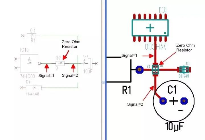 有人說0?電阻跟沒有一樣,干嘛不直接連接上?想象一下,如果你在電路原理圖里沒有這個0?電阻,做PCB Layout的時候就可能忽略這個單點(diǎn)連接的原則,CAD軟件也會亂連在一起,達(dá)不到你單點(diǎn)連接的初衷。