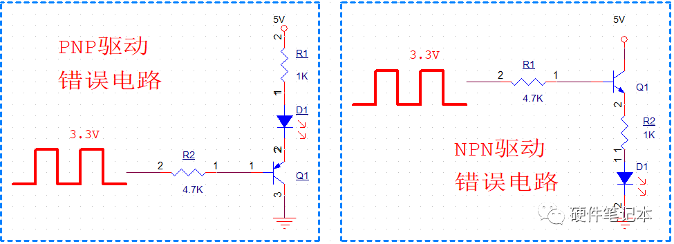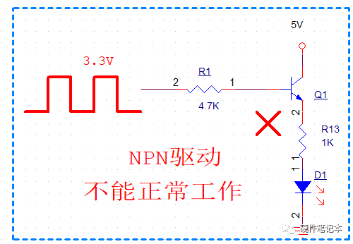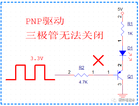當(dāng)輸入低電平時,三極管開通,LED正常點(diǎn)亮。當(dāng)輸入高電平時,Vbe=5V-3.3V=1.7V>0.7V,三極管開通,LED正常點(diǎn)亮。