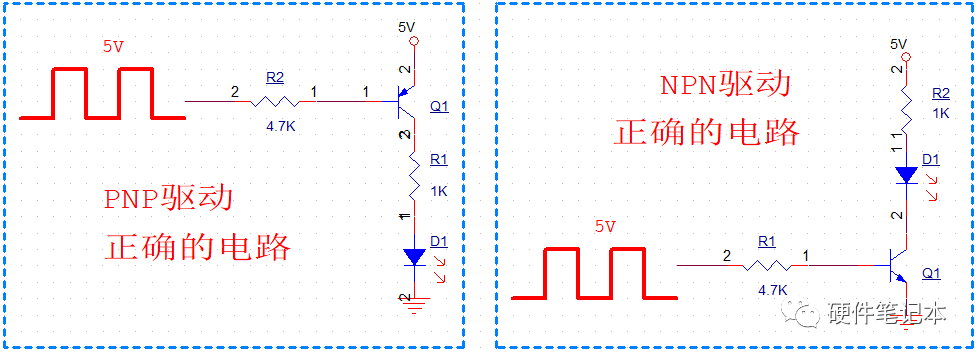 兩個電路的負(fù)載LED都接在三極管的發(fā)射極,以NPN三極管電路分析: